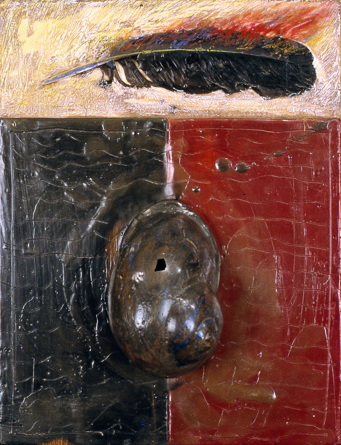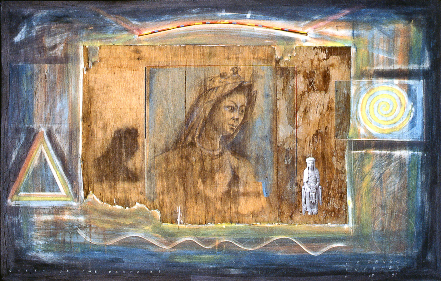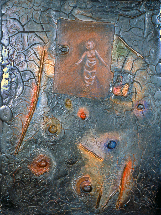 The work represented by these ten images is part of a body of work I made while residing in Bucelas, Portugal; 1990-1991 and Portland, Oregon; 1992-1996, collectively called Queen of the Earth. The images and symbols represent the emerging feminine motive energy (anima in men). The process of creation is spontaneous and represents many media, clay/glue grounds, found objects, tempera pigments, powdered graphite, wax and wood.